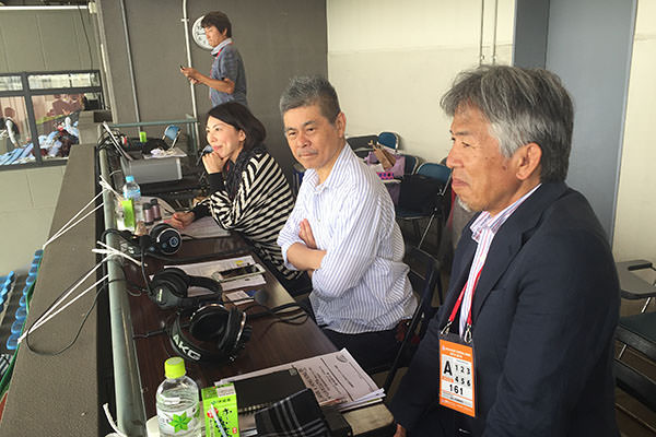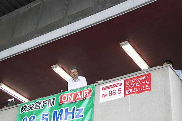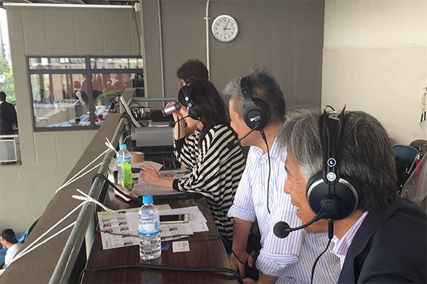 ▲ラジオブースでは双眼鏡で確認しながら実況する、丸山さんの技も見られました。