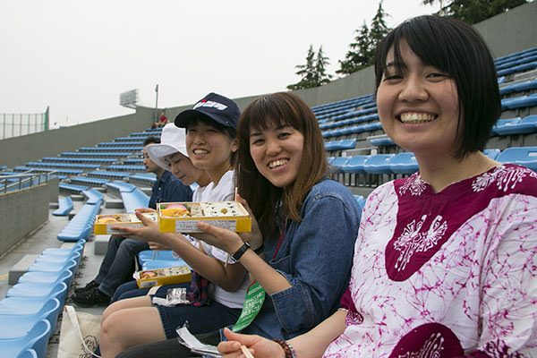 ▲交代で休憩をとるほぼ日乗組員も、お弁当を食べながら観戦します。