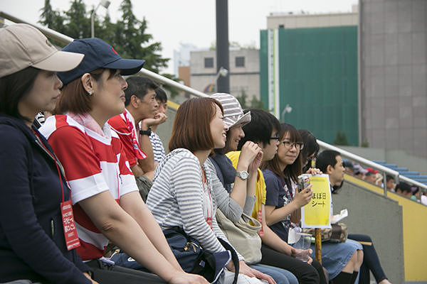 ▲女子の試合は初めて観る糸井も、会場の雰囲気を味わっています。