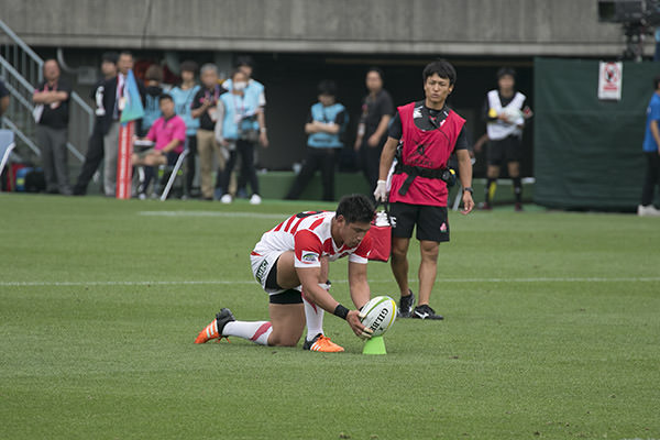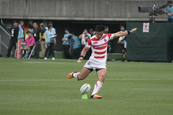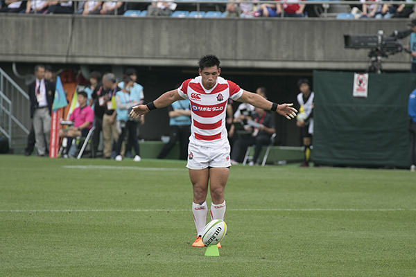 ▲トライ後のゴールキックを務めるのは中村亮土選手。決めれば+2点です。