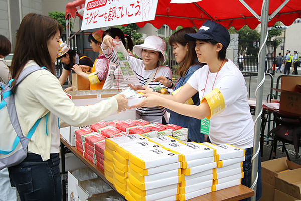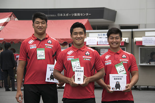 ▲外では代表の練習生(U20日本代表)が熊本地震の募金活動。笑顔がさわやか!