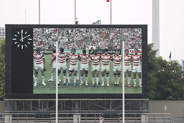 ▲大型ビジョンにも肩を組む選手が映されます。これから国歌斉唱です。