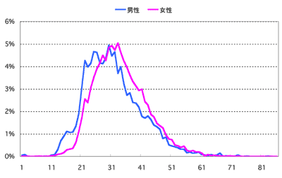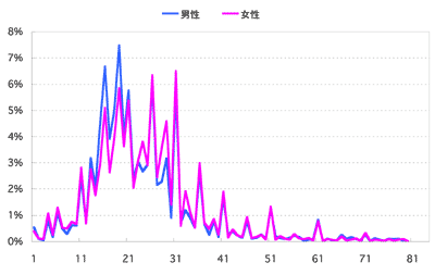 でも、女性の魂年齢のピーク(いちばん人数の多いところ)は