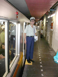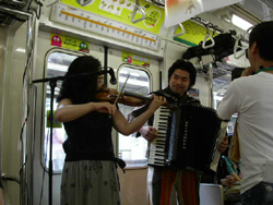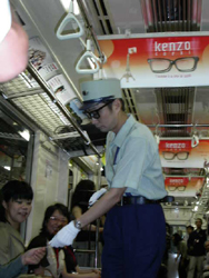 という感じでした。 写真レポートができてます。 ![]() ![]() ![]() このように、営団地下鉄の正規制服を貸与され、 地下鉄帽子をかぶってのパフォーマンス。 日本発売になった「スシ頭の男」でも TOPを飾るセルジュ・ゲンスブールの 「リラの門の切符きり」を中心としたライブになります。 車両内には、「スシ頭の男」の 中吊りポスターも作ってもらい、 まさに地下鉄ライブであります。 ![]() さて、この地下鉄、 上野の普段は絶対入ることのできない、 操車場から発車。 そこで参加のお客さんも乗車しました。 ![]() その操車場は、地下鉄操業の心臓部ともいえ、 女トイレもない、男の城。 にもかかわらず、気さくな雰囲気と、 やわらかな笑顔の人々が印象的でした。 営団の方は、面白い人が多く、人前で挨拶されるときも 「毎度ご乗車ありがとうございます!」 と話をはじめ、 ツカミはそのヘンの芸能人よりもスゴイです。 なかなか開放的な気風なようですね。 メカニックと工具あふれる操車場から、 電車の顔面の正面から階段で入ります ![]() そして今回は銀座線の車両で、 赤坂見附駅まで銀座線の線路、 そこからなんと丸の内線に入り、中野坂上までいき、 そこから引き返して最後は、 荒俣宏さんの小説でも描かれた、 幻の新橋駅に到着するという企画でした。 電車の中では、パリで有名なダニエル・コランの家で、 本格アコーディオン修行した サブロウ率いるサブ&マミ、ハンガリーで 唯一本格ジプシーヴァイオリン修行をした日本人、 YUKAといっしょに、 本場パリの地下鉄ミュージッシャンに 決して負けないパフォーマンスを繰り広げたつもりです。 ![]() 昭和初期にたった8ヶ月だけ使用されたという 幻の新橋駅のドアをあけるとすぐに ピカピカの地下構内。 ![]() あっという間に現実に引き戻されましたが、 営団始まって以来の特別イベントを やり終えた満足感でいっぱいでした。 なお、これらのイベント写真が 期間限定(9月24日まで)で http://inu.run.to/ にアップされてます! ごらんください! さて、この地下鉄イベントの関連イベントとして、 この27日(水)に午後3時から、 六本木ヒルズ「アリーナ」で、 入場無料コンサートが開かれます。 告知が直前でごめんなさい。 また、地下鉄の制服が着れるかもしれません。 みんな来てね!