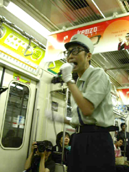 | 総武線猿紀行第180回(号外!) MIDS&史上初の営団地下鉄イベントが大成功! で27日にまたまた 地下鉄フリーコンサートがあります! え〜〜、8月23日(土)は長い一日でした。 告知いたしましたように、夜9時からは、 オールナイトでMIDSというイベントを 青山CAYでやりましたが、 特別ゲストにムッシュかまやつ氏は、 予定通り現れました。 「ゴロワーズを吸ったことがあるかい?」他3曲を、 大変な味わい深い枯淡の境地で演奏され、 全く衰えることの知らず、 新しい味を出されていたのには驚きました。 イベントのテーマでもある、 ムッシュ自体の存在意義の、 60年代のフレンチ&MODSについて、 非常に内容の濃いトークもでき、 最高のひとときを過ごせました。 イベントは、他も大変に盛り上がり、 たくさんの人に来ていただきました。 ありがとうございました。 レギュラーのMIDSは次は 9月26日(金)午後10時「青い部屋」 です。 ゲストは「新宿フォーク」ゲストDJはハスキー中川、 みんな来てね! さて、その8月23日、昼間は、 限定参加募集のため、 ここでは告知しませんでしたが、 営団地下鉄の車両の中で、ライブをするというもの。 営団のHPに告知された案件は以下です。 営団地下鉄では、来年4月の民営化に向け、 お客様に地下鉄の楽しさや親しみやすさを 感じていただくことを目的として、 「第26回日本文化デザイン会議」 (8月22日(金)〜8月31日(日)六本木ヒルズにて開催) とタイアップし、銀座線特別編成列車で、 サエキけんぞう氏をはじめ 「日本文化デザインフォーラム」の会員である 講師5名が各車両ごとに 特別講座「メトロで遊ぼっ!」を開催するとともに、 このイベントの参加者を募集いたします。 詳細につきましては下記のとおりです。