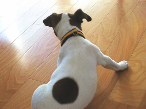はじめてつける首輪をいやがるルーシー。