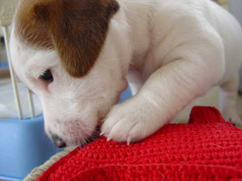おもちゃをかむニコ。