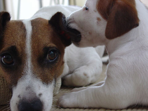 「ちょっとかんでみよう」と、ルーシーの耳をガブリ。