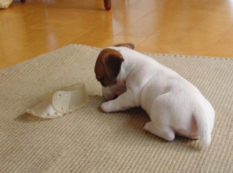 くつの形をした犬用ガムと奮闘中。