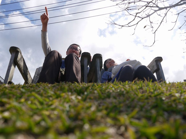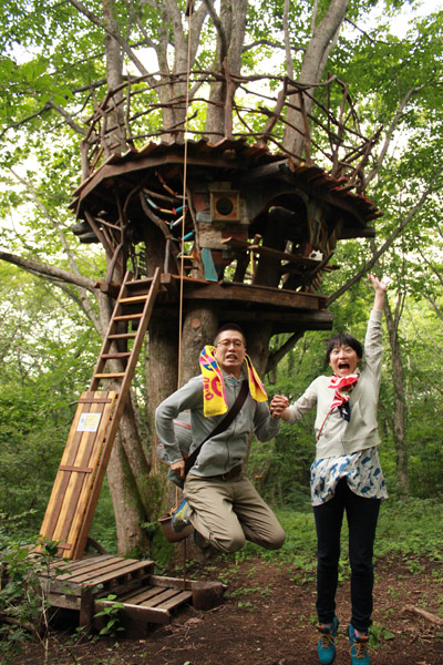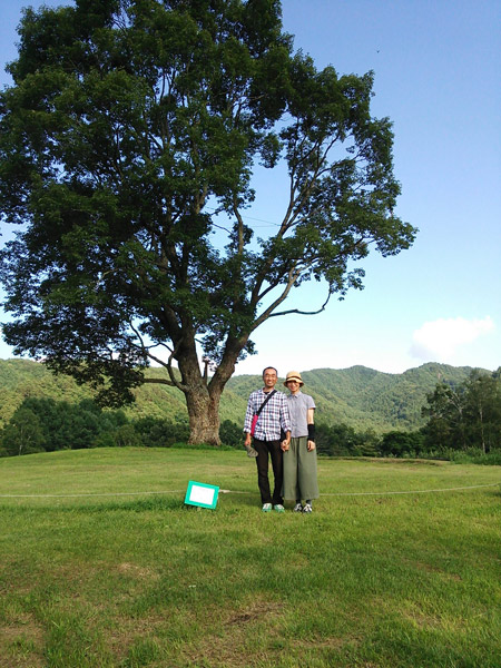 彼の思い出の木と一緒に写真を撮ろうとして、