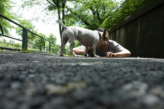 「劇団セルフタイマー」の 新しい公演。 蟻など地を這う観客に向けての、 果敢な挑戦です。 雨上がりの歩道に這いつくばって、 監督はなにかを訴えています。 女優は、いつもの通りとも言えます。