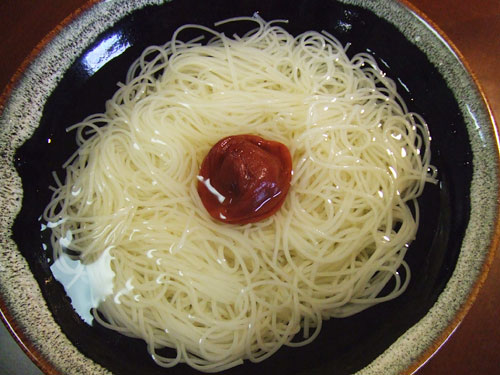 ゆでたそうめんを冷水とともに器に入れ、梅干しを配置。