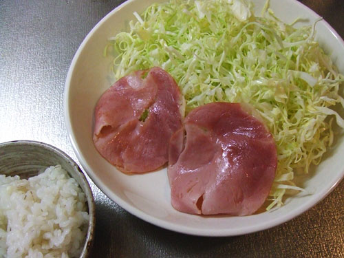 一口かじったハムにキャベツを後追いさせて食べ進む。