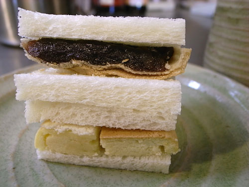 和菓子を横半分にスライスし、塩をふってサンドする。