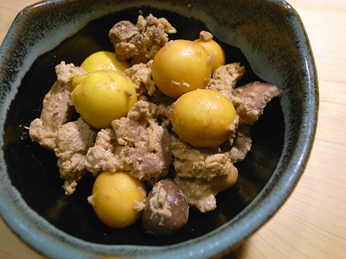 こってり甘辛く煮つけられた鶏モツ煮を、