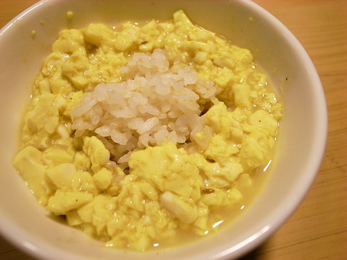 醤油仕立てのあんかけ豆腐の上に、白飯を盛った。