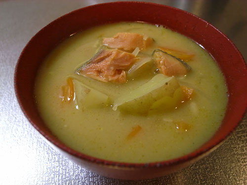 見た目は鮭のシチューのような粕汁ができた。