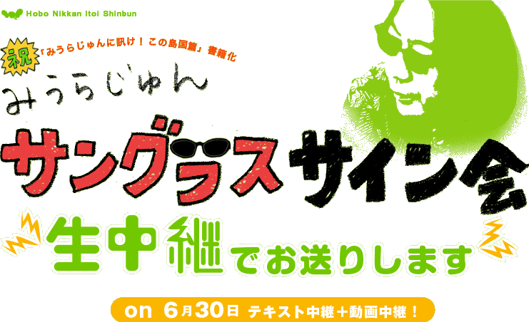 | ほぼ日 | このサングラスのしおりに、 みうらさんがひたすらサインするようすを テキスト中継でお送りしたいと思います。 日時は、6月30日(火)、 午後3時から6時くらいです。 つまり、この記事の更新の翌日です! 明日! |