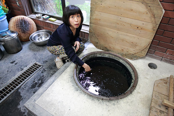 ![]() ▲藍染めの甕(かめ)に手を入れる三國さん |