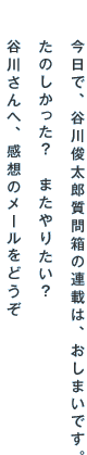いままでの谷川俊太郎質問箱 回答編 谷川さんへ、感想のメールをどうぞ いますよ。あなたもそのひとりです。 谷川俊太郎さんの答え 宇宙人って ほんとうにいるんですか?  (波蘭 十四歳) 質問 ゴールデンウィーク特別企画 谷川俊太郎質問箱 なんもん、ぐもん、うけつけます。 ザ・回答編  2006年、ゴールデンウィークです。 「ほぼ日」は、詩人の谷川俊太郎さんと すごすことに決めました。 読者のみなさんから届いた質問に、 ゴールデンウィークの期間中、 谷川さんが毎日ひとつずつ、答えていきます。