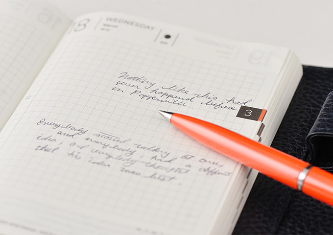 手帳とも相性のいい、ノック式の油性ボールペン。