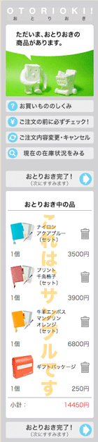 | 「ほぼ日・注文のおおいストア」では、 「おとりおき」システムでお申し込みいただけます。 やりかたはとってもかんたん! ※いますぐお買い物をしたい方は、 ページの上の方にある、このボタン、 をおしてくださいね!