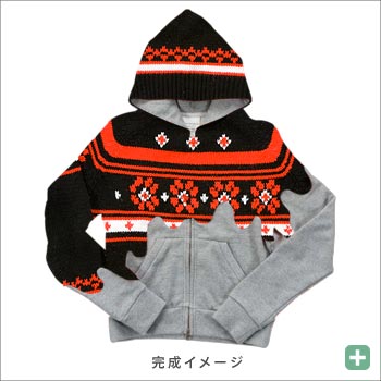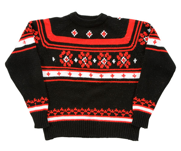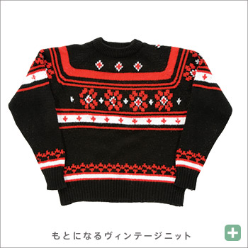 スキーセーターの一種ですが、他と違う点があって、 模様をジャガード編みでもインターシャ編みでもなく、 ハンドステッチで入れているんです。 ボディーは細番手のアクリルの糸で 軽い質感で編まれているのですが、 そのハンドステッチが 適度なクラフト感を醸し出しています。