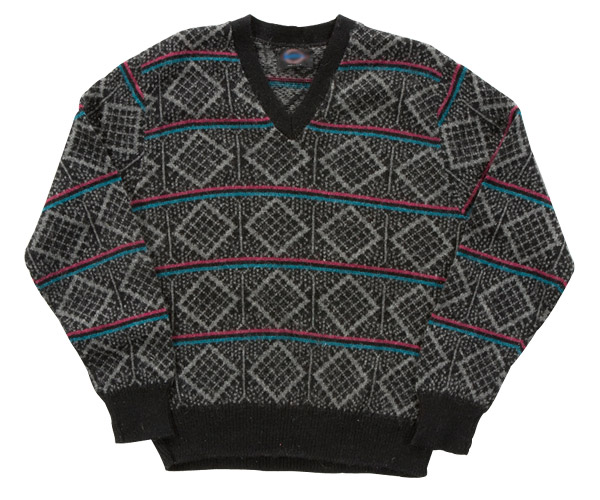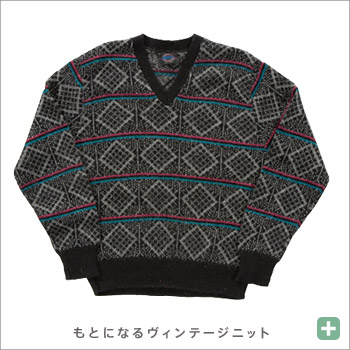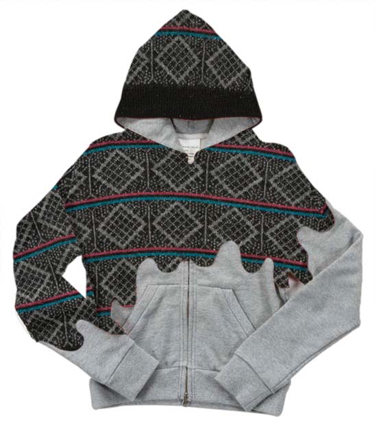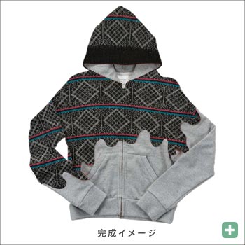 フェアアイル柄の変形型というか、 1つのモチーフを、総柄でリピートしています。 黒とグレーのモノクロの淡々とした模様の中に ターコイズブルーとピンクのラインが入る感じが 個人的にはとても好きです。 パーカに仕立てるとフードの部分にも ブルーとピンクのラインが入ります。