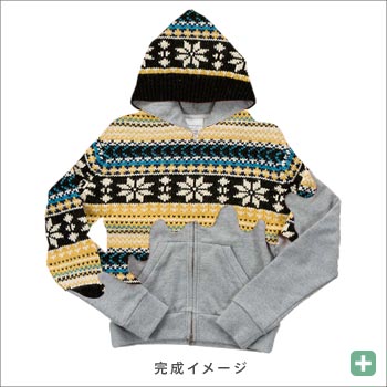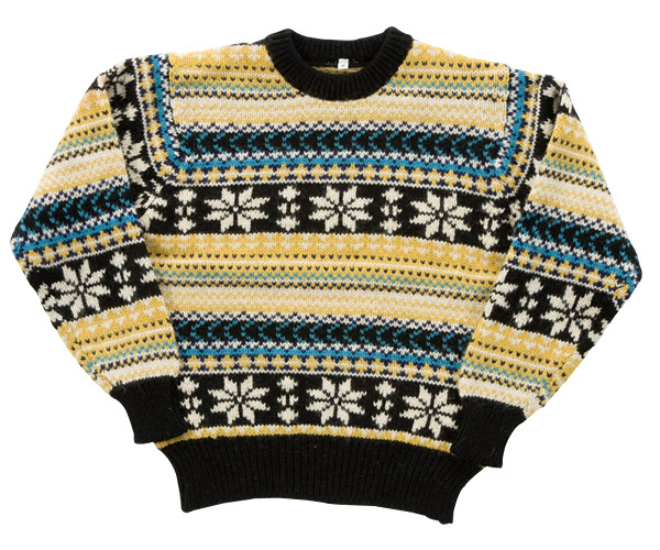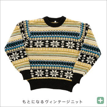 4色使いのフェアアイル柄です。 ネイビー、アイボリー、黄色、ブルーの それぞれの配色のバランスが絶妙で、 特にブルーの配色が奇麗です。 沢山の色を使っているのに 全体のまとまりがよく見えるのは、 ヴィンテージセーターの柄がとても繊細で、 クラフトっぽさがあるからだと思います。