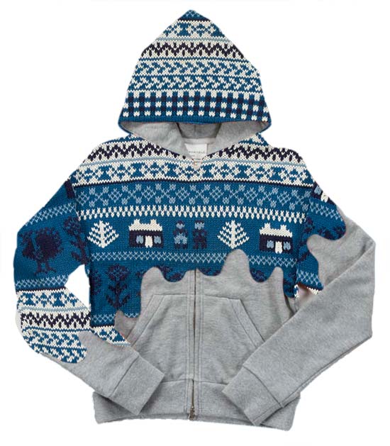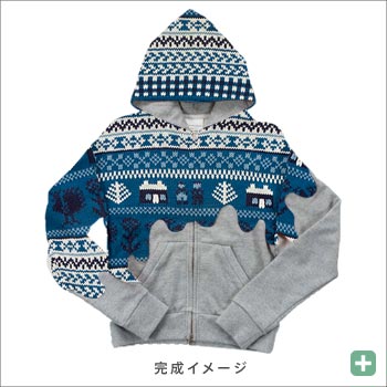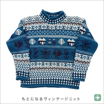 フェアアイル柄をベースにしていますが、 一番印象的なモチーフは家です。 どなたかが個人的に 手編みで編まれたものだと思います。 コットンの太い糸でずっしりと編まれているのですが、 こういう、ハンドメイドでクラフト感のあるものを、 リキッドというコンセプトに落とし込むと、 とても不思議で魅力的な商品になるんです。