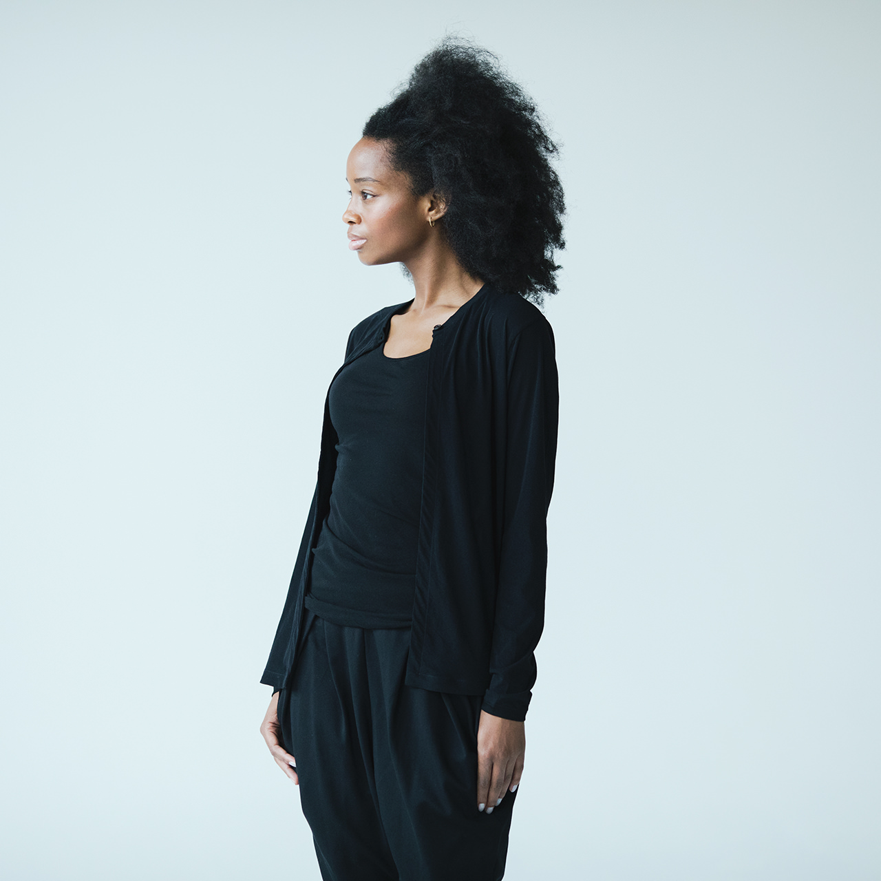 気がるに羽織れるよう、ボタンは襟もとに1つだけ。