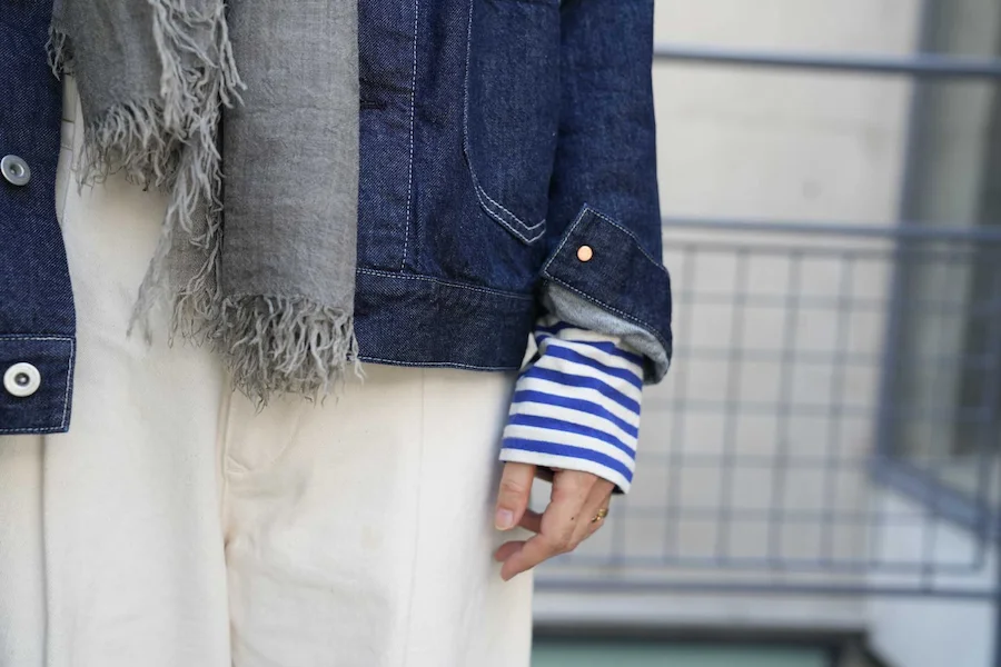 色みがブルーと白でまとまってマリンテイストなので、 そこに寄りすぎないよう首元にはストールを。 レディスのデニムジャケットはノーカラーなので、 巻き物をつけても襟がじゃますることなく、 すっきり合わせられると思います。