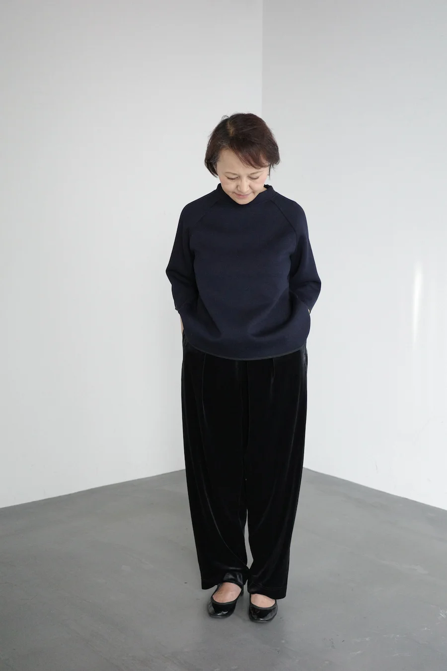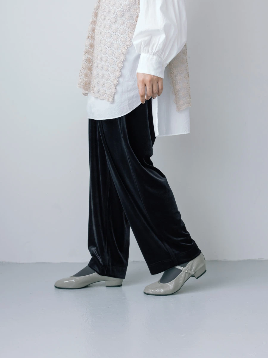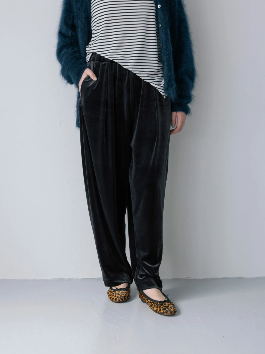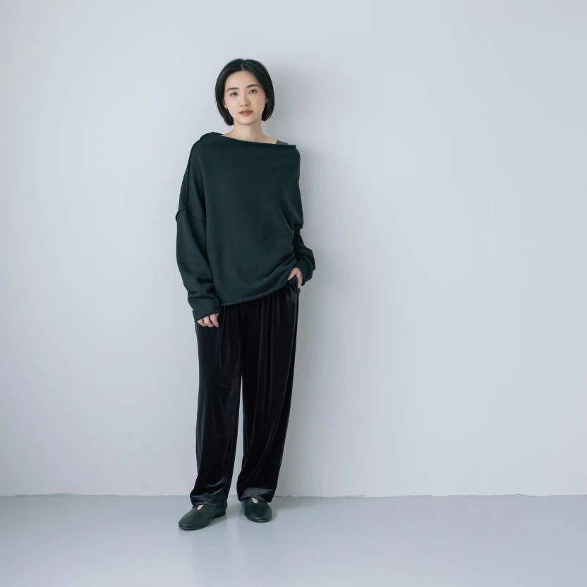 ―― らくちんな穿き心地だけど、それでいてかっこよく、 上品に見える冬のパンツがあったらいいなって ずっと考えていました。 そこで思いついたのがベロア素材。 ベロアなら、落ち感やドレープがきれいに出て、 きっとすてきになるんじゃないかと思って 宇和川さんに相談させてもらいました。