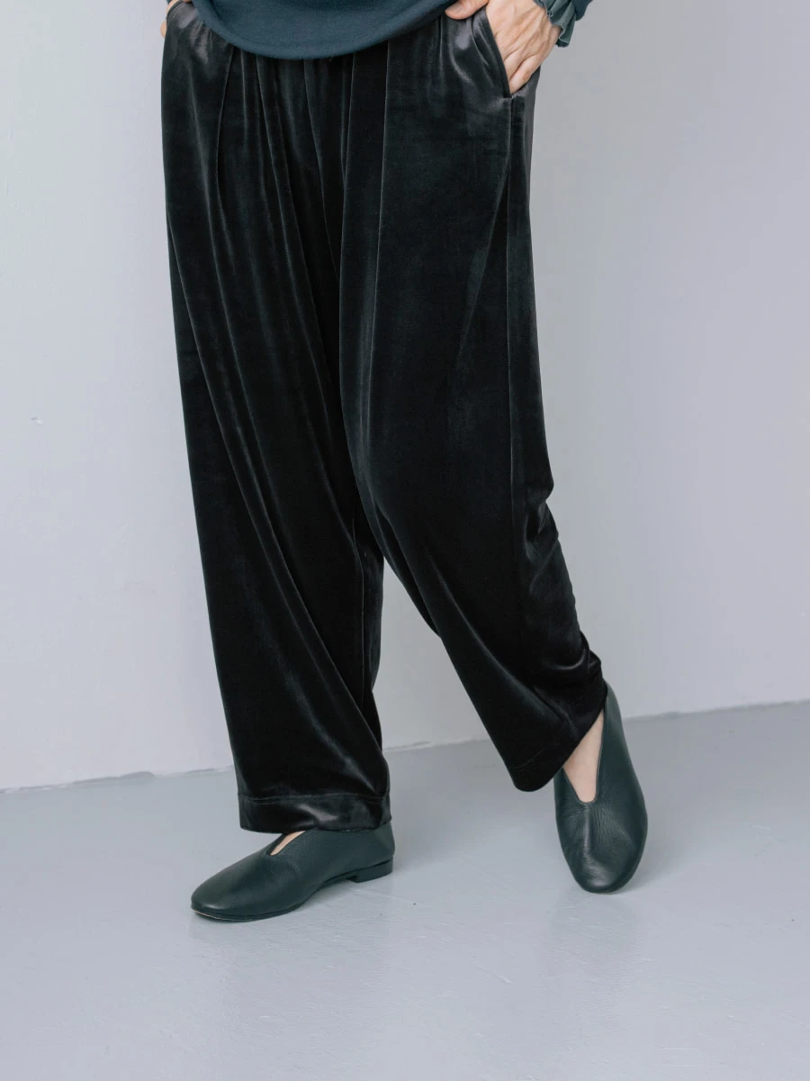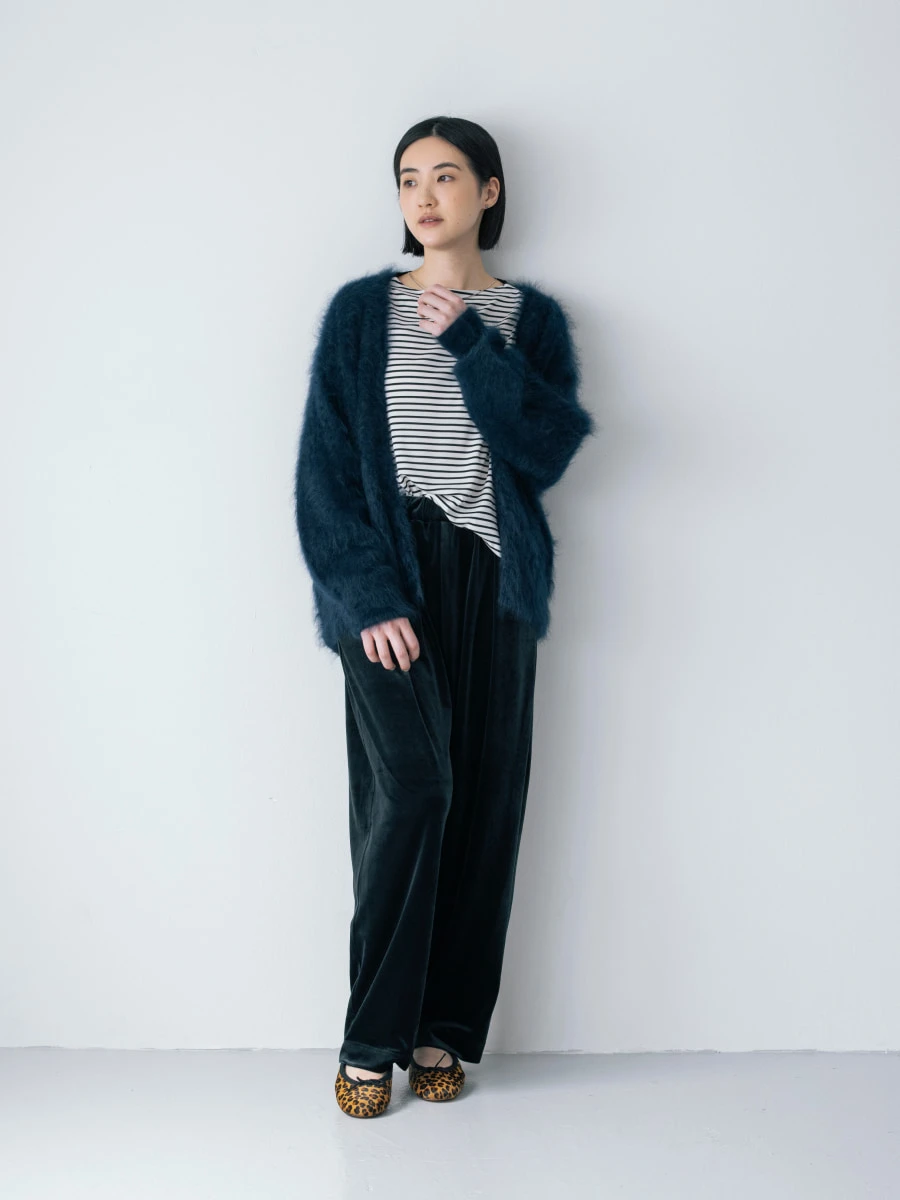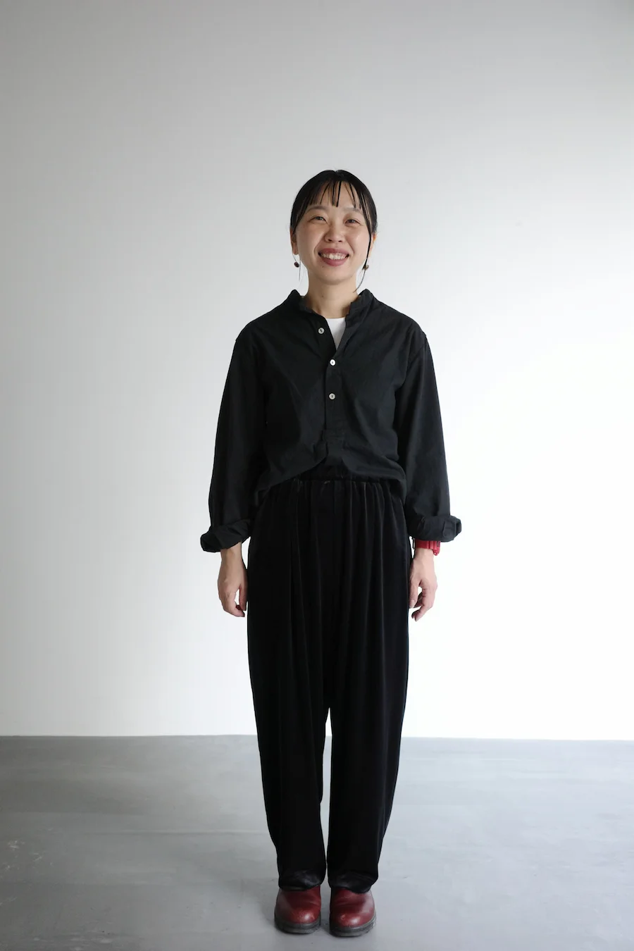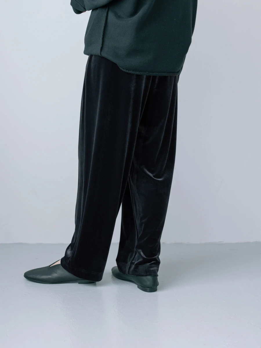 ―― らくちんな穿き心地だけど、それでいてかっこよく、 上品に見える冬のパンツがあったらいいなって ずっと考えていました。 そこで思いついたのがベロア素材。 ベロアなら、落ち感やドレープがきれいに出て、 きっとすてきになるんじゃないかと思って 宇和川さんに相談させてもらいました。