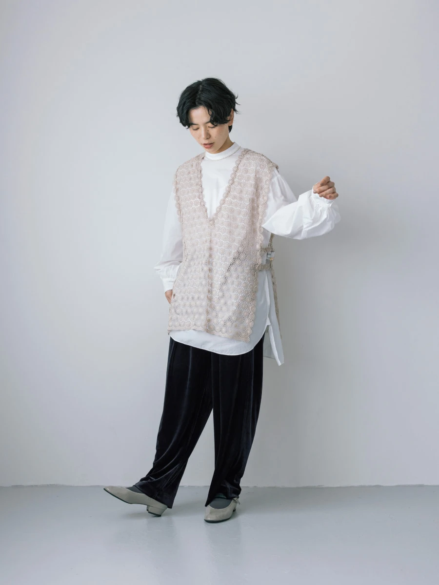―― そんな上品見えするベロアパンツですが、 ウエストが総ゴム+紐の仕様で イージーに穿けるというのがポイント。