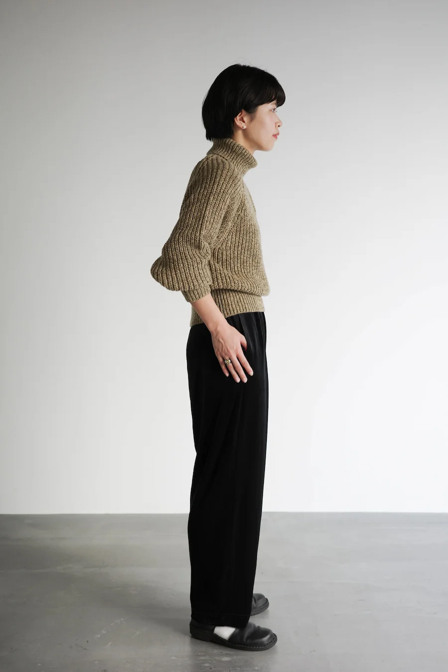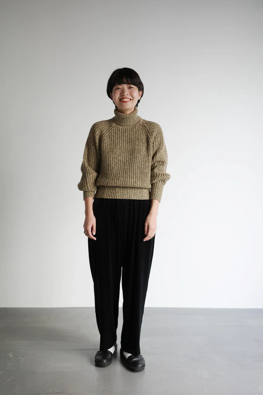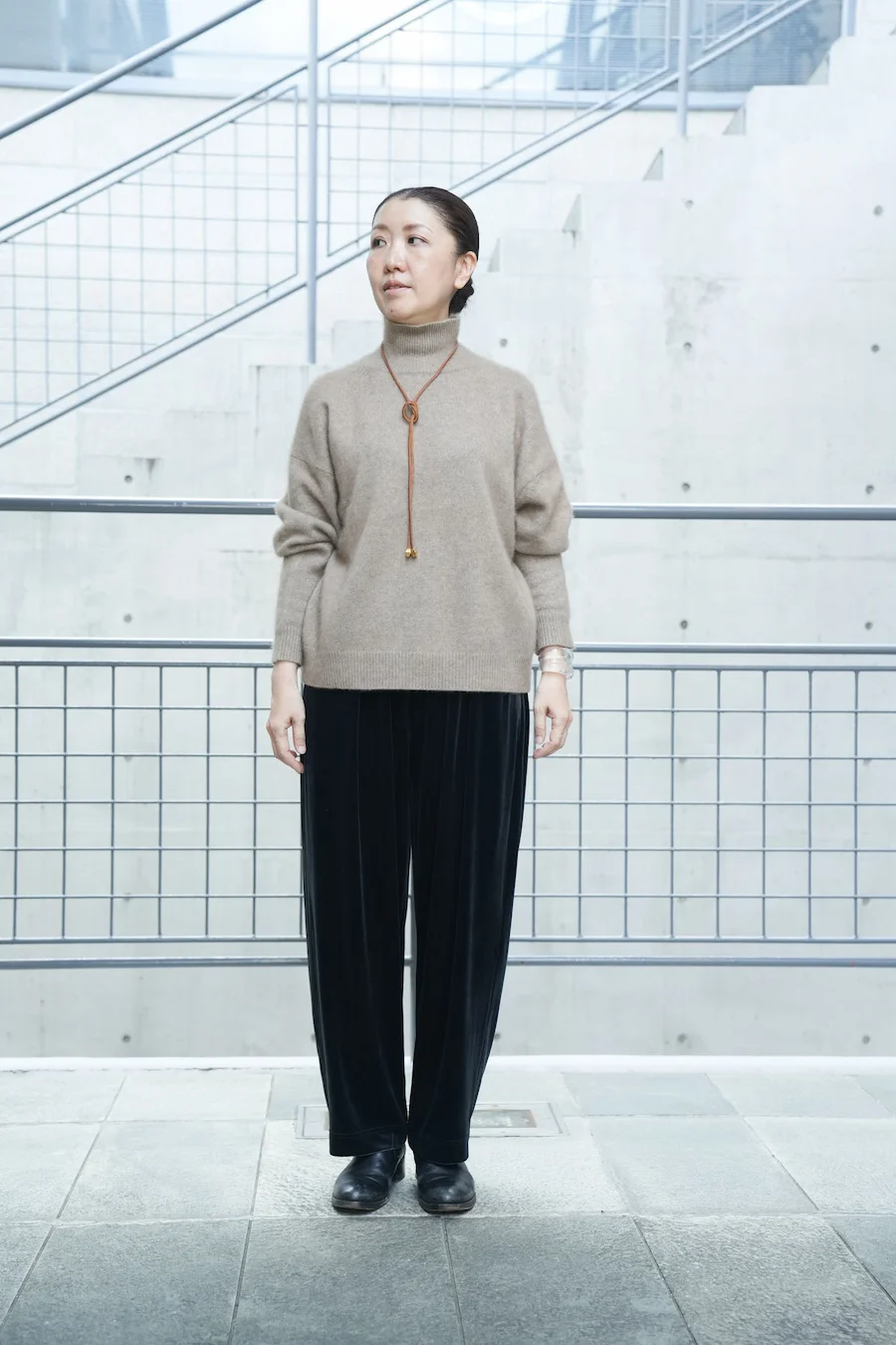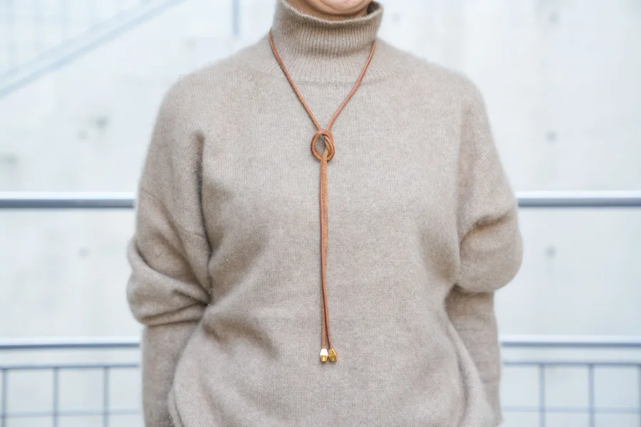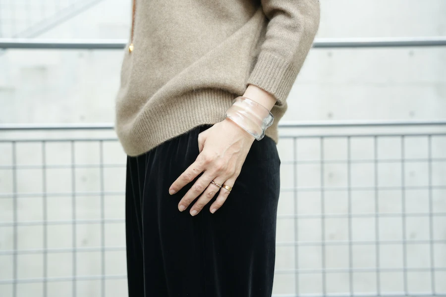 パンツに存在感があって、 なにもしなくてもかっこよくなるので、 あまり奇をてらったことはしていません。 毎冬着ているお気に入りの カシミヤのタートルネックニットを合わせて、 素材感のちがいをたのしんでみました。 細いレザーのネックレスや 半透明なアクリルのバングルなどの アクセサリーを足して、表情をつけて。