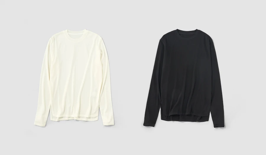白井 ハイブリッドラマの厚手のものがほしくて 何年もかけて試作していたのですが、 ようやく納得いくものができました。 ハイブリッドラマの4代目にあたる、 「ハイブリッドラマ4」。 強撚した綿糸をスムース編みにしたのにやわらかいという、 本来なら相反することが両立できた、奇跡の生地です。 生地をつくるにあたって、 やわらくて落ち感があることはゆずれませんでした。 強い撚りをかけるとゴリっとかたくなってしまうんですが、 原綿のランクを上げることで、 やわらかさもかなえられました。 スムース編みは、両面つるっときれいな編み地になって 伸縮性もいいんですが、ウレタンが入っていたりすると、 のびて縮んだときにポコッとかたちが 残ってしまうことがあります。 でも、これは強撚しているので、のばしても元どおり。 のびかたも倍以上、の約2.3倍のびますから すごく着やすいと思います。 厚手ゆえに白でもほとんど透けませんので、 ぜひ素肌に直接着てみてください。
