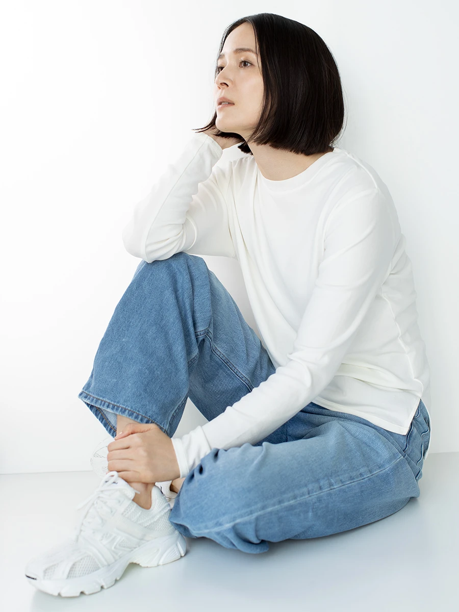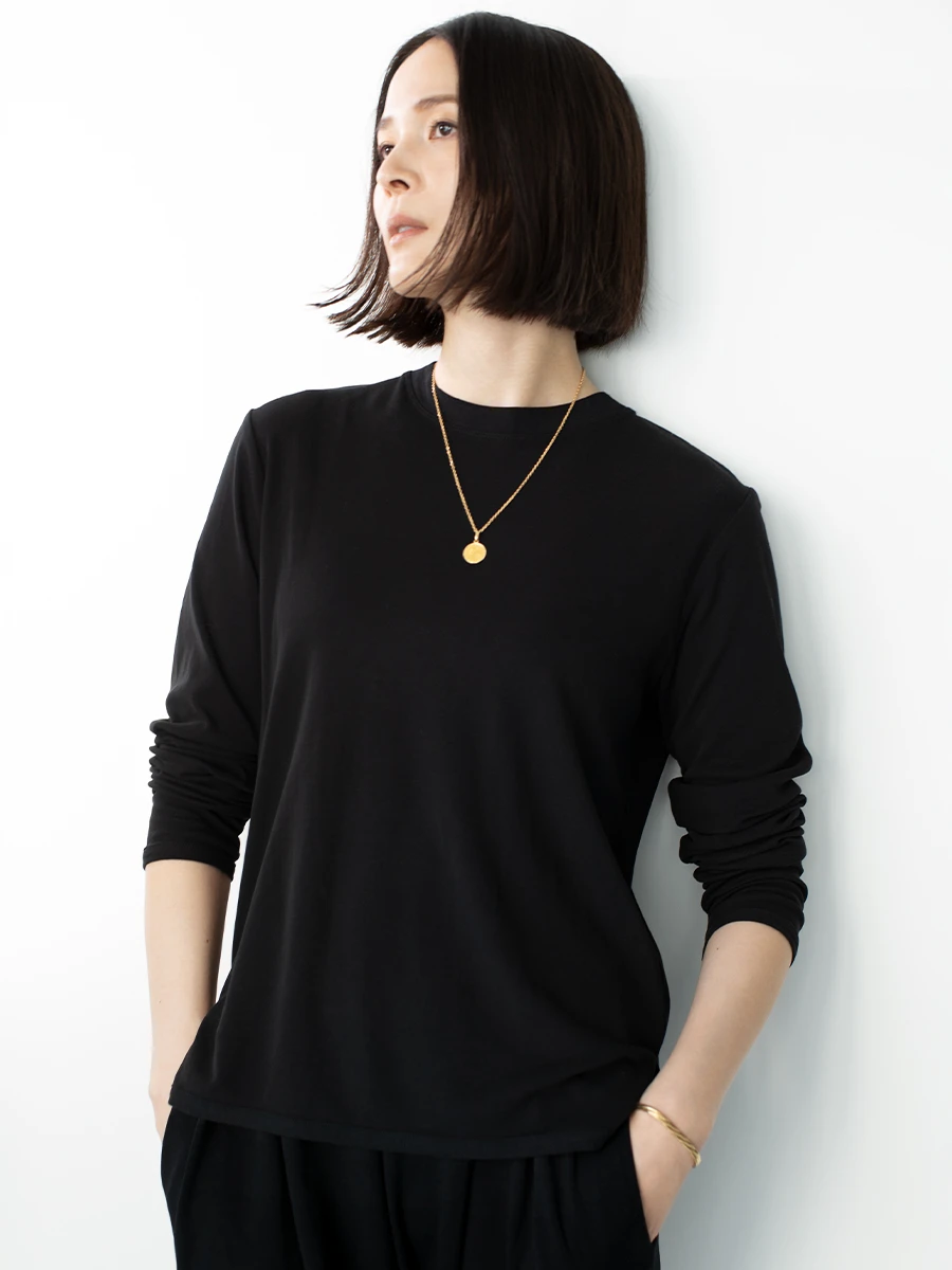 佐伯 この夏はほぼハイブリッドラマで過ごしました。 身のまわり品で手ばなすものが増えていくなかで、 ハイブリッドラマはずっと手元においておきたいもの。 ハイネックのカットソーはお気に入りのひとつ。 一見同じように見えても、毎年、毎シーズンごとに サイズやシルエットを見直しているんですよ。