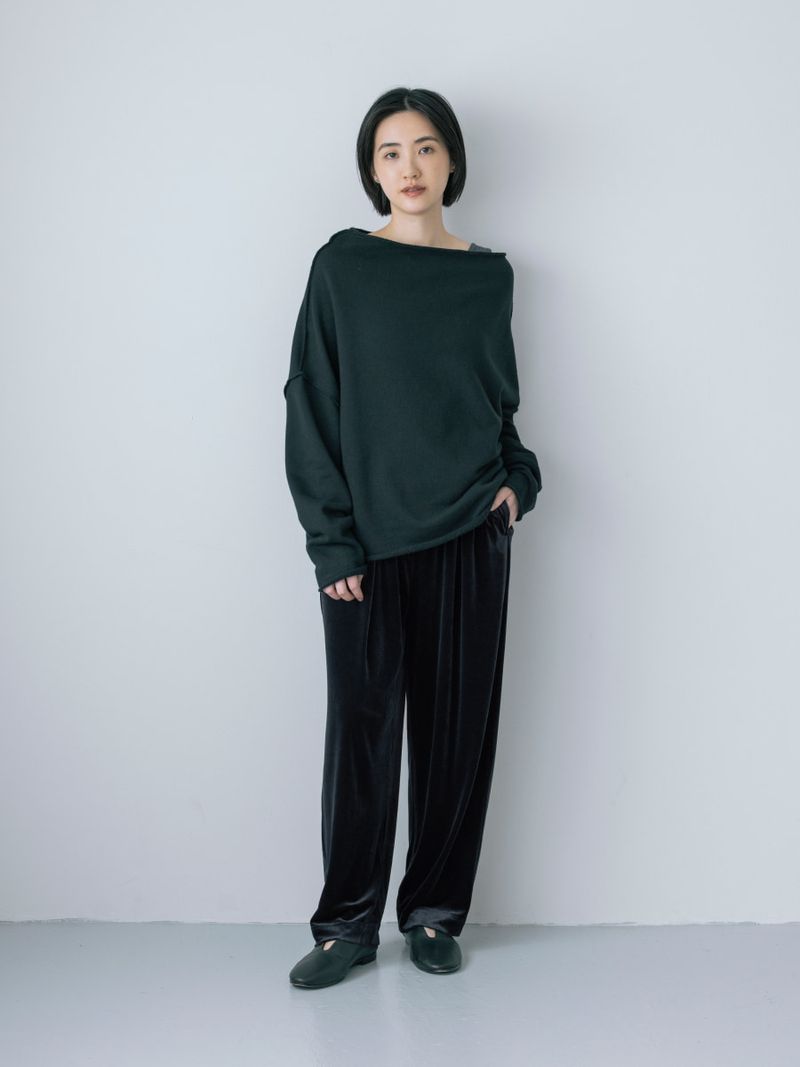 着てみると、まさに絶妙な光沢感。 深みのある落ち着いた色の中に、 静かにつやっとした質感があって、 なんて上品なベロア!と思いました。 きれいに着たい時、カジュアルに着たい時、 合わせるものでどちらの気分も受け止めてくれます。