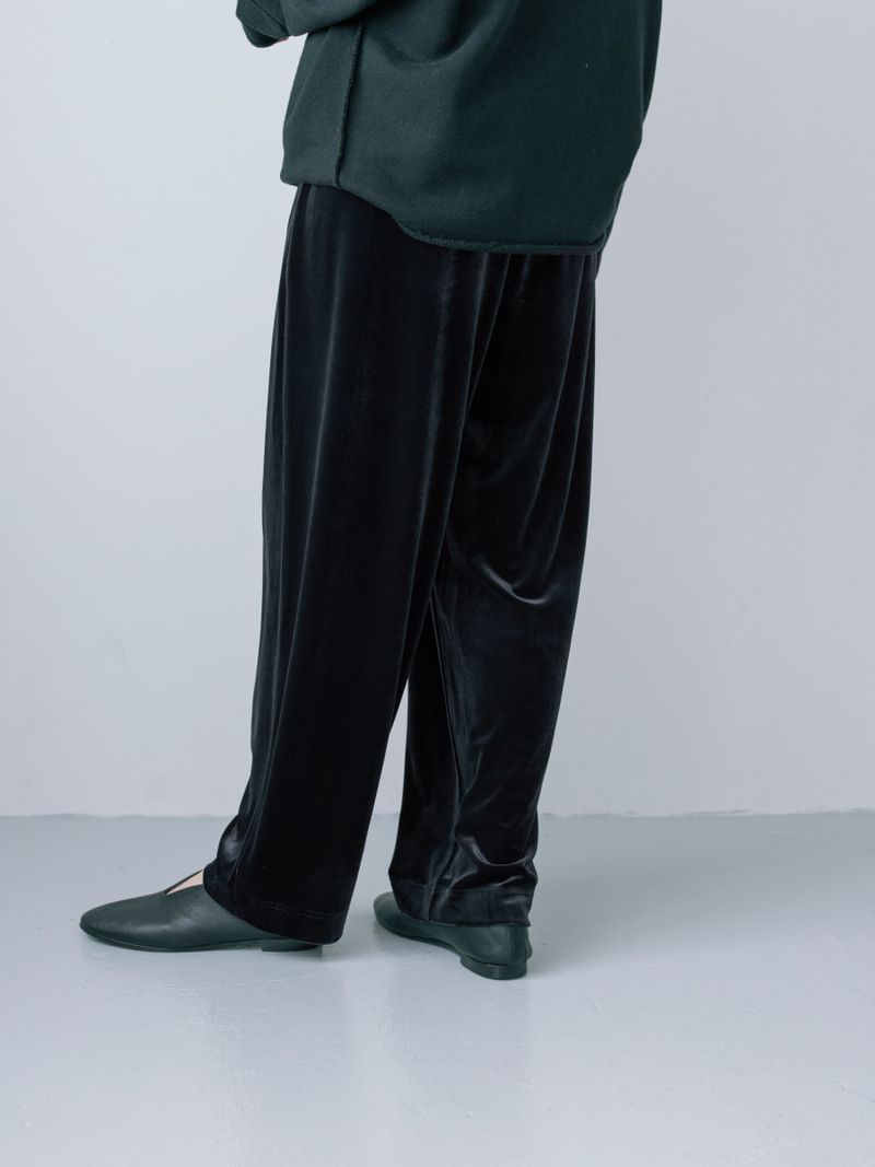 ラインがきれいなので、トップスはカジュアルでも、 ちょっときれいめでも受け止めてくれる。 合わせる靴も、スニーカーからローファー、 バレエシューズ、ヒールまで なんでもしっくり馴染んでくれる。 ベロア素材ですが、落ち着いた光沢なので 華美になりすぎない。