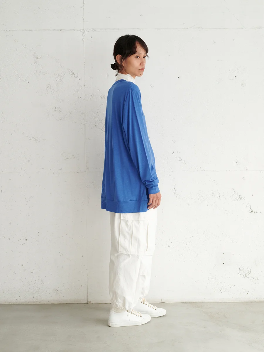 袖丈は少し長めにして、 手元からちらっとブルーがのぞくように。 腕が短めの方でも安心してください。 袖口で止まって、くしゅっとたわむ感じもかわいいですよ。