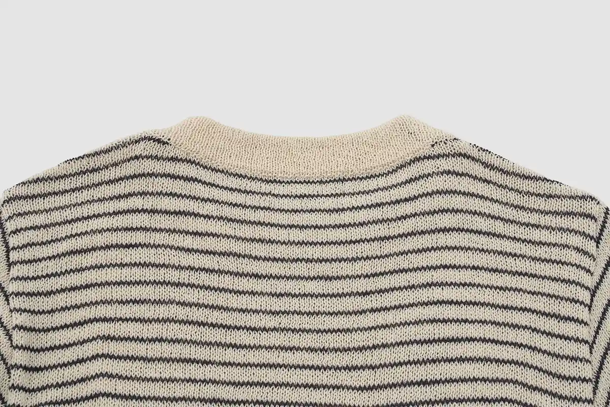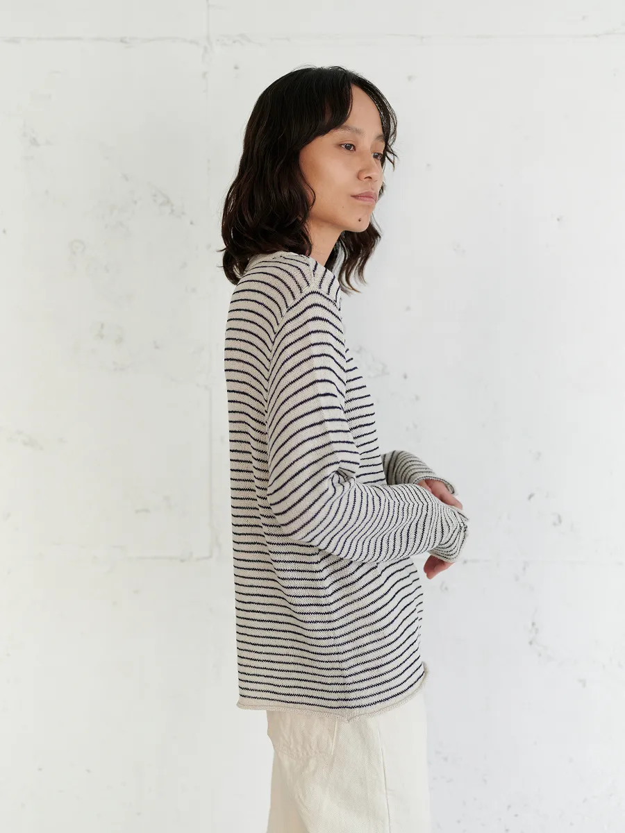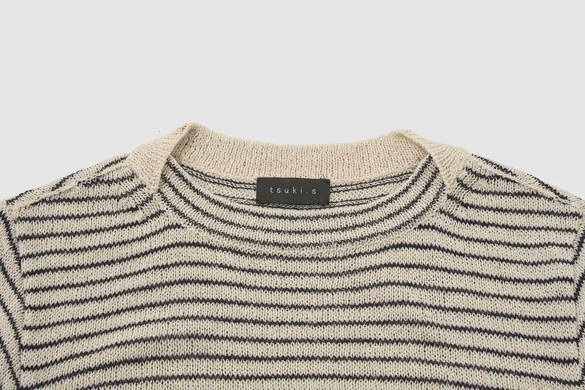 襟は、わたしの好きなボートネック。 編地のテンションがややゆるめなので、 襟元はきっちりダブルにして、 ゆるめのリンキング(1目1目を合わせて チェーンステッチのように縫製する方法)で仕上げています。