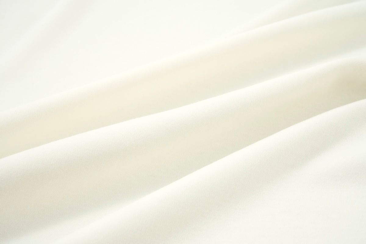 白井 さらに、スムース編みなので、 肌にあたる裏面もなめらかです。 36ゲージという細いゲージで編んでいるので、 ツヤっと光沢のある生地感に仕上がっています。 スムース編みって、一般的には伸びやすく、 形がくずれやすいのですが、 これは強撚糸のおかげでよく伸びて、しっかり戻る。 形がくずれにくいのが大きなポイントです。