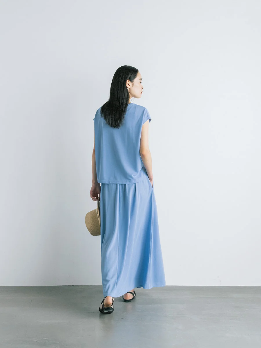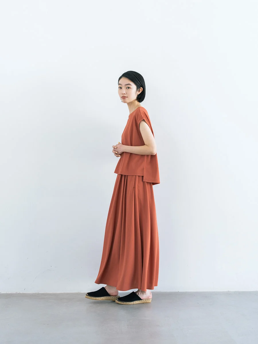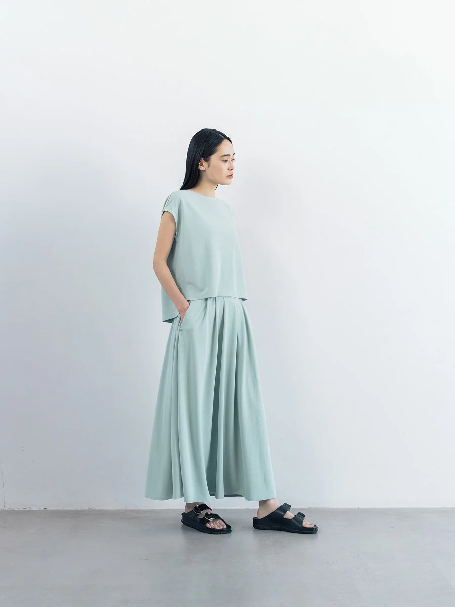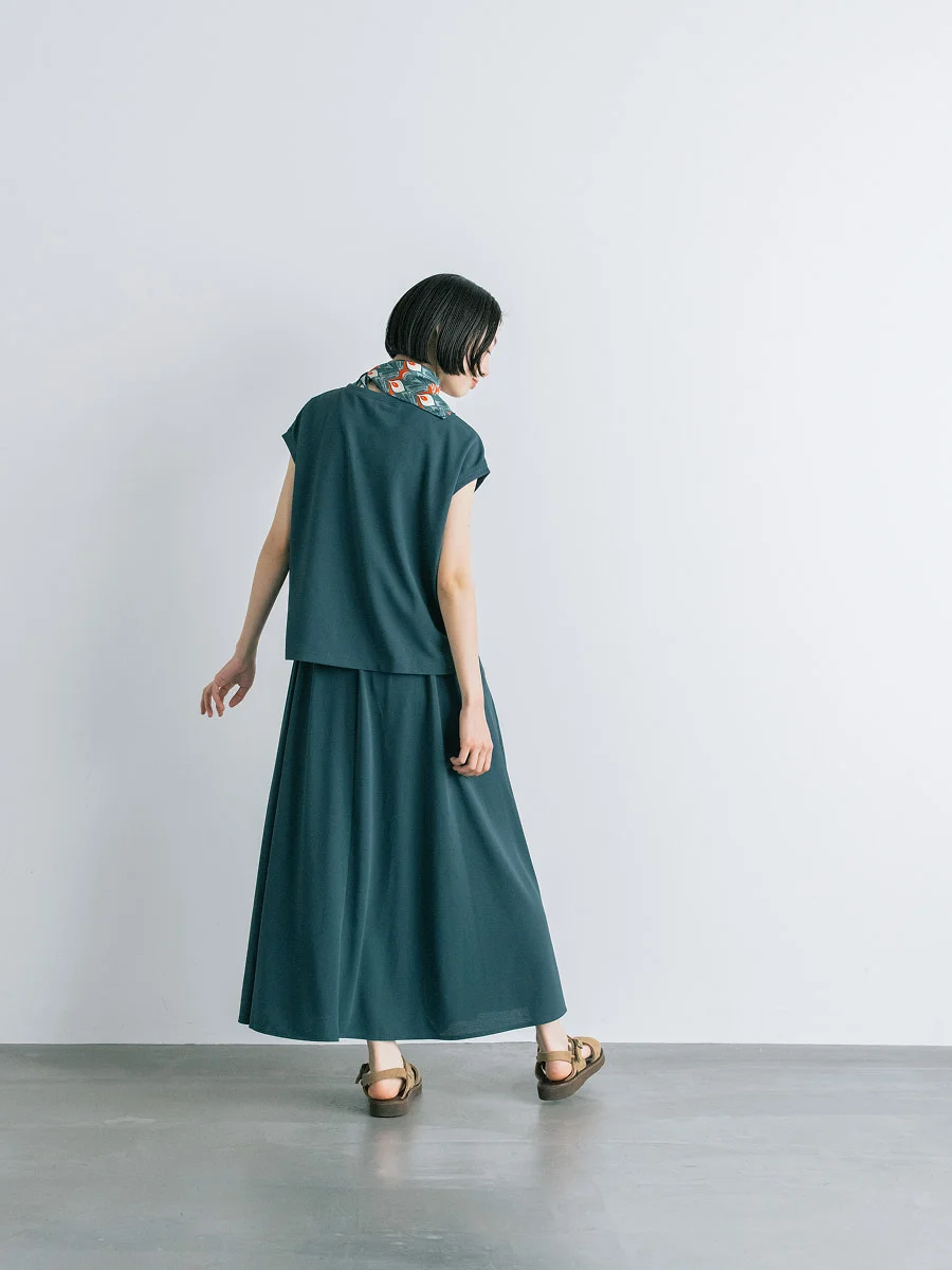 末永 細い方だったらきゅっと締めればいいしね。 フロントのタックがあることで、 ドレープがきれいにでます。 後ろはギャザーたっぷりなので 大柄な方でも問題なく穿いていただけると思います。