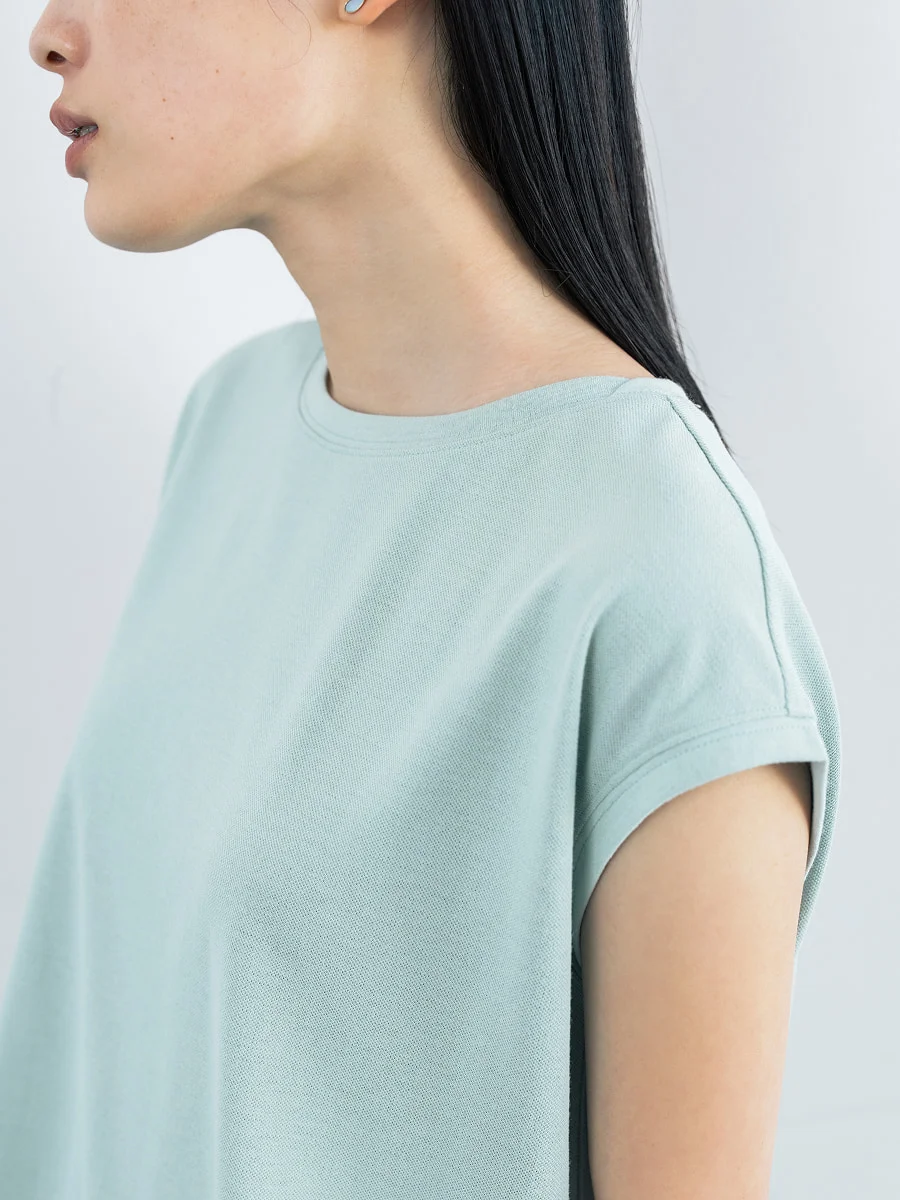 末永 襟もほんのり横に広がるボートネックのかたちだから、 襟元の切り替えを両端で重ねています。 襟元が波打たないためのデザインでもあり、 ちょっとかわいく見えるかなって。