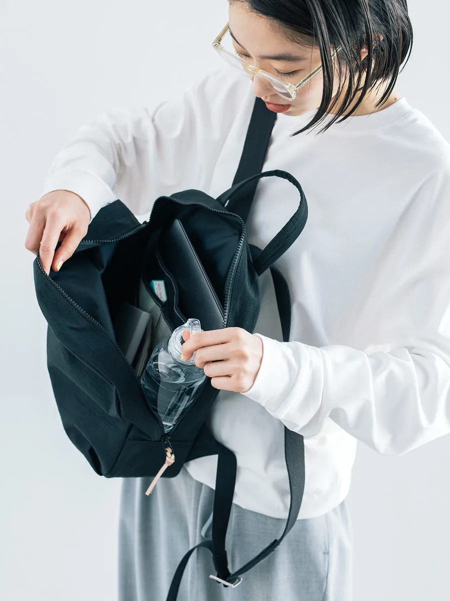 ―― リュックとハンドバッグの 2WAYで使えるような感じですね! わたしはMサイズをほぼ毎日使っているんですが、 Sサイズにも、いつも入れているノートパソコンやお財布、 ポーチ、飲み物が問題なく入りました。 とくに飲み物はホルダーがあってべんり!