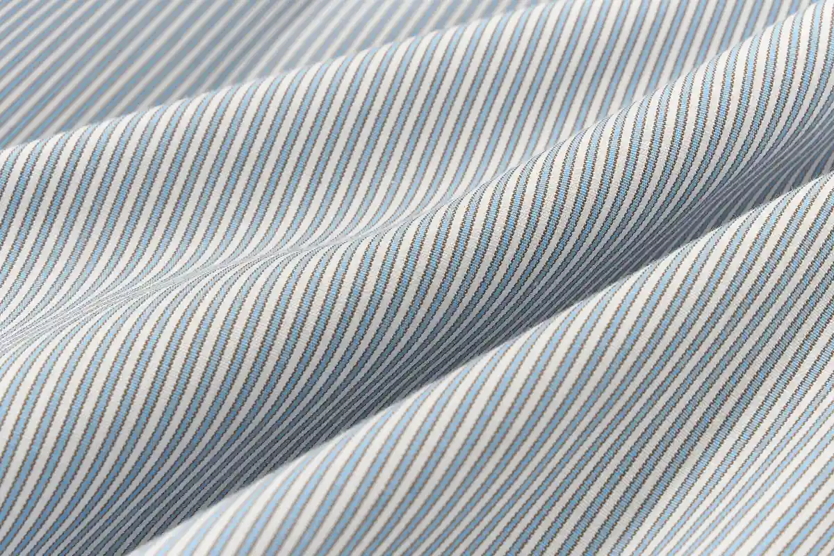 浅川 ストライプはシャツ専門メーカーの生地を使っています。 青と白の単純なストライプでなく、 青、白のほかにオレンジっぽい色の 細いラインも入っているんですよ。