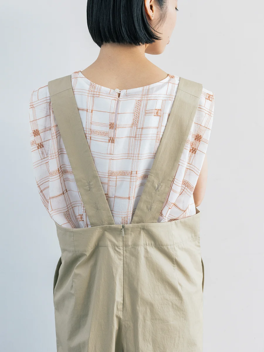 浅川 サロペットはもう世の中にたくさんあるから、 つくらせていただくならシンプルにいこうと。 肝は生地の分量。 ウエストや胸まわりのサイズ感を出しつつも おしりまわりの生地は出すぎず、 やぼったくならないさじ加減で、 胸から股上が長いのもポイントです。 そこが短いと子どもっぽくなるので、 長さを調整して、幅もちょっと太くして、 横から見たときにすっきり見えるようにしました。