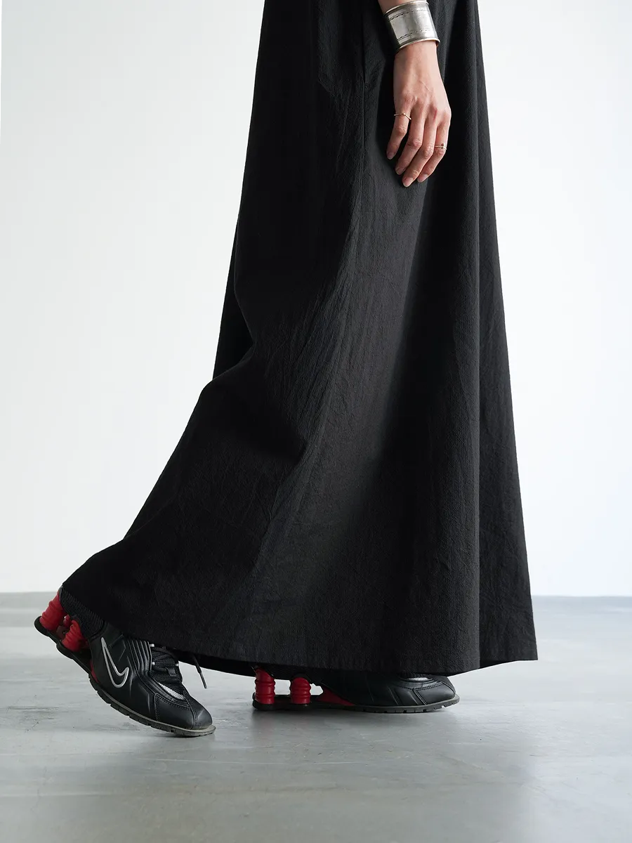 ワンピースは、かたちがすごくきれいに決まっていたので、 1枚でさらっと、かっこよく着たくて。 アクセサリーをすこし足して、 靴は、裾のカッティングがよりきれいに見えるように、 ちょっと高さのある ヒール付きのスニーカーを合わせました。