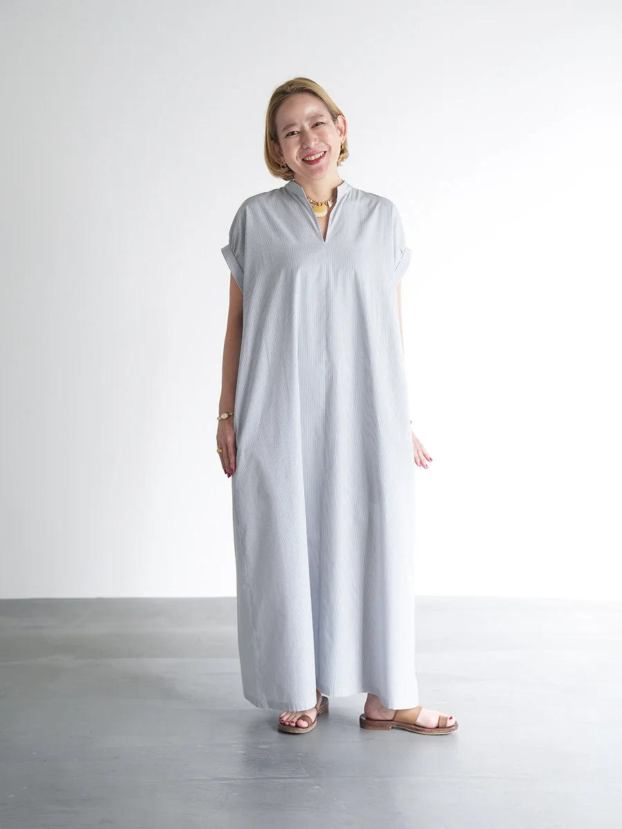 今回着た〈O2〉のワンピースは、 素材の違いが楽しめるデザイン。 チャコールとストライプの2色、 サイズ違いでどちらも袖を通してみました。